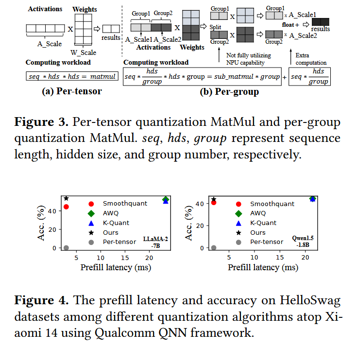하지만 NPU는 병렬적인 per-group MatMul(Matrix Multiplcation)과 같은 복잡한 연산은 수행하지 못하므로, 각 group별로 tensor를 쪼개서 각각에 대한 MatMul을 순차적으로 수행한 후 FP(Floating-point) sum operation으로 더해야 한다고 한다(Figure 3). 이 경우 10.7x만큼의 performance overhead가 존재한다. 이에 따라 아래 그래프(Figure 4)에서 확인할 수 있듯이, group quantization을 적용하는 K-Quant, AWQ는 NPU에서 latency가 높다.