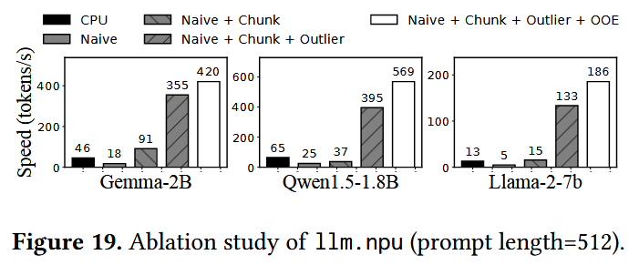 NPU를 naive하게 활용하는 경우 성능이 떨어졌지만, chunk-sharing graph는 1.46x ~ 5.09x의 성능 향상을, shadow outlier execution은 3.91x ~ 8.68x의 성능 향상을, out-of-order subgraph execution은 18% ~ 44%의 성능 향상을 보였다고 한다.
