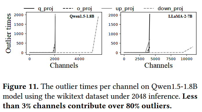 llm.npu는 enhanced per-tensor quantization을 적용한다. 즉, W8A8로 per-tensor quantization을 적용하는데, activation outlier들에 해당하는 weight들을 추출해 둔다.