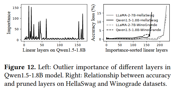 하지만 관찰에 의하면 대부분의 outlier들은 accuracy에 대해 중요도(CPU 연산이 필요한 정도)가 높지 않다. 왼쪽 아래 그래프는 각 layer에 대한 중요도를 나타낸 것으로, 이때의 중요도는 가장 큰 outlier 값을 대응되는 scaling factor로 나눈 값이다. 즉, 중요도가 높을수록 scale에서 더 많이 벗어난 outlier이므로 CPU에서 연산되어야 함을 나타낸다.