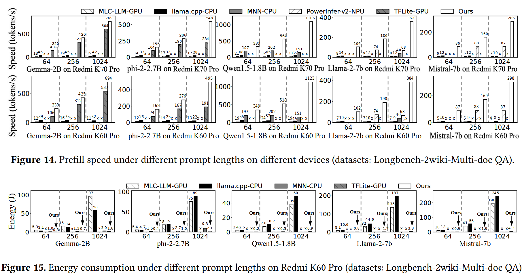 prefill performance는 speed와 energy consumption으로 측정했고, 2개의 device와 5가지 LLM에 대해 prompt length를 64, 256, 1024로 해서 수행했다. 이때 여러 dataset에 대해서 prefill preformace 향상이 크지 않아서, LongBench dataset으로 실험했다고 한다. LongBench는 prompt의 길이가 매우 길어서 prefill phase 성능의 비중이 높다고 한다.