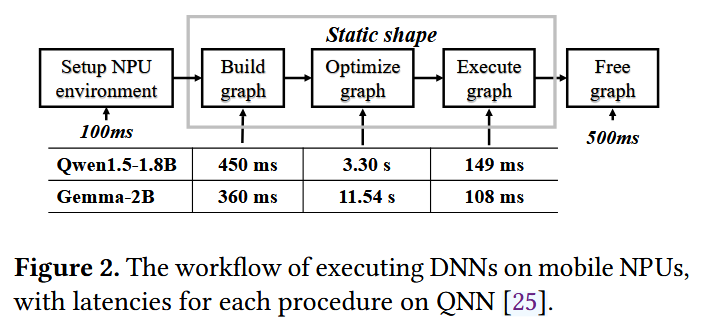 현재의 mobile NPU는 efficiency와 최적화 등의 측면에 따라 static computation graph만을 지원한다. 즉, static shape의 prompt만을 처리할 수 있는데, LLM prompt는 dynamic하다는 문제가 있다. 이에 따라 새로운 단순히 shape의 prompt가 입력될 때마다 매번 computation graph를 새로 build/optimize하거나 단순히 padding을 추가해 연산하는 것이 가능하기는 하지만, 두 방식 모두 비효율적이고 비용이 높다. 특히 전자의 경우 ms도 아니고 s 수준의 latency가 발생하므로 CPU 또는 그 이상으로 느려진다고 한다.