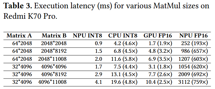 아래 표와 같이 mobile LLM이 주로 수행하는 matrix size에 대한 MatMul 성능을 Redmi K70 Pro에서 실험한 결과, NPU INT8 성능은 CPU INT8, GPU FP16, NPU FP16보다 성능이 뛰어남을 알 수 있다. 즉, NPU의 INT8 SIMD architecture에 의해 NPU는 INT8 MatMul에 대해 최적의 성능을 보인다.
