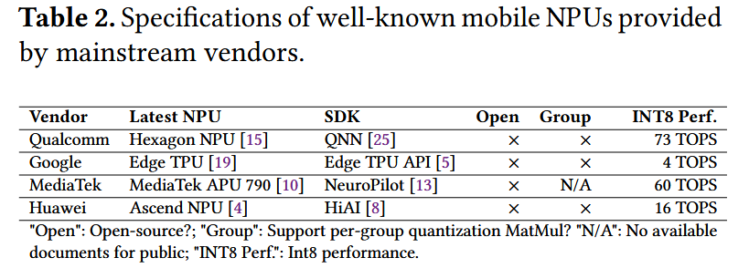 이런 prefill latency를 줄이기 위해, 저자는 mobile SoC(System on Chip)에 포함된 NPU(Neural Processing Unit)를 활용하는 것을 제안한다. NPU는 특히 INT8과 같은 INT-based MatMul 연산에 적합하다고 한다. 아래는 주요 제조사들이 제공하는 NPU 목록이다.