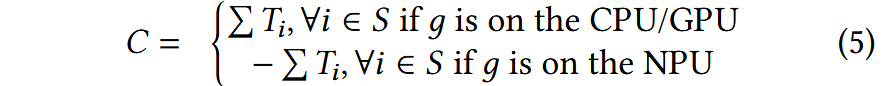 여기에서 $C$는 contribution 값, $g$는 subgraph, $S$는 g가 실행된 직후에 실행될 수 있는 subgraph들의 집합, $T$는 해당 subgraph의 실행 시간이다. g가 CPU/GPU 연산인 경우 이후 실행 사능한 NPU 연산의 실행 시간이 길수록 stall이 적은 것으로 판단하고, g가 NPU 연산인 경우 이후 실행 가능한 CPU/GPU 연산의 실행 시간이 짧을수록 stall이 적은 것으로 판단한다. 논문에 더 자세한 설명은 없지만, CPU/GPU 연산의 실행 시간이 길다면 관련된 NPU 연산에 stall이 발생할 수 있기 때문으로 보인다.