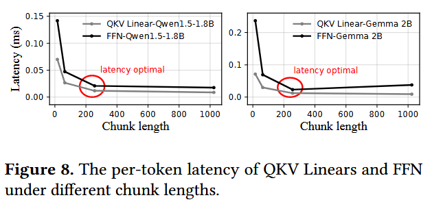 논문에서는 특정 환경에서 memory consumption을 75%까지 줄였다고 한다. 그리고 아래 그림과 같이 Xiaomi 14에 대해 Qwen1.5-1.8B와 Gemma-2B로 실험한 결과 최적의 chunk length는 256이었다고 한다. 물론 이런 profiling은 NPU별로 수행되어야 한다.