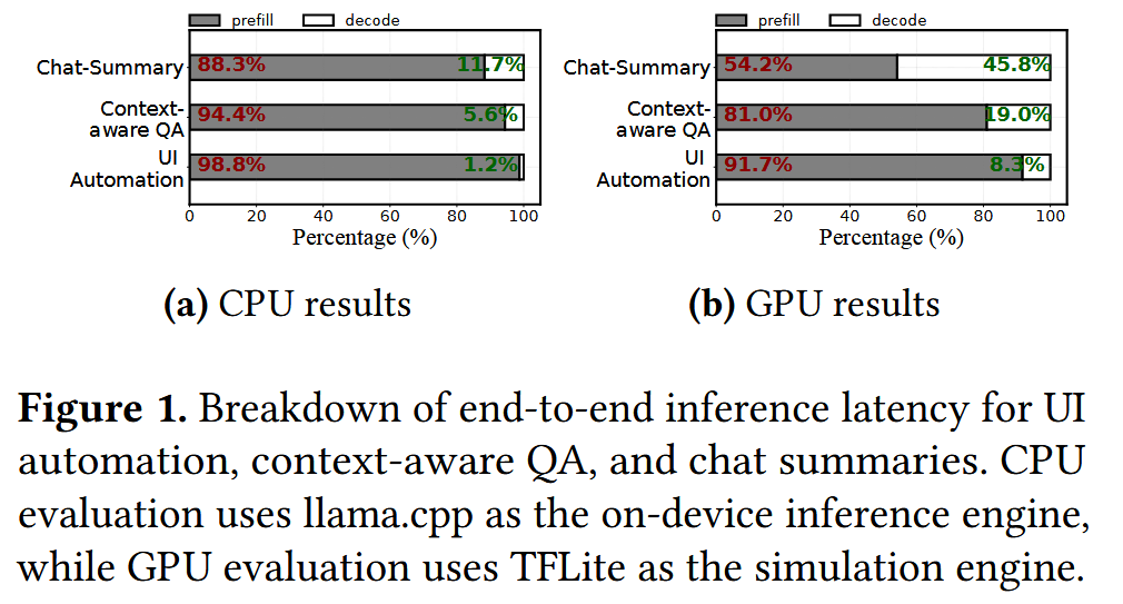 mobile LLM task는 personalized, context-aware generation을 위해 long prompt에 대한 처리를 수행하므로 prefill latency가 큰 반면, output length가 대체로 짧아 decoding latency가 적다. 예를 들어, automated email reply의 경우 다양한 사용자 데이터를 고려해야 하고, UI automation의 경우 HTML 파일들과 사용자 명령을 고려해야 한다.