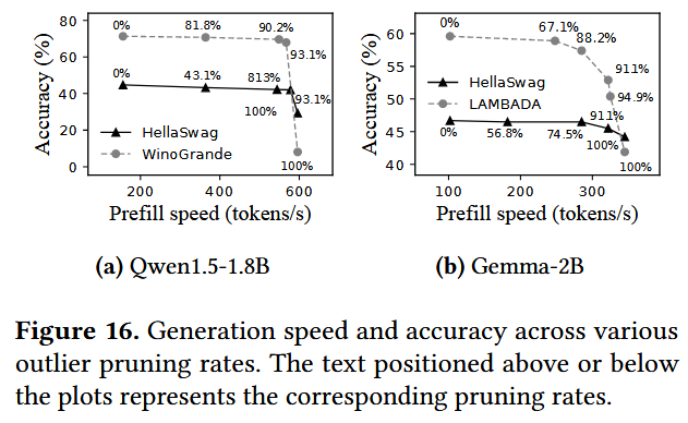 참고로 이때 llm.npu의 pruning 비율에 따라 accuracy와 latency는 trade-off 관계에 있다고 한다. 실제로 실험 결과 아래와 같이 pruning을 많이 할수록 latency는 짧아지지만 accuarcy는 떨어지는 것을 확인할 수 있다.