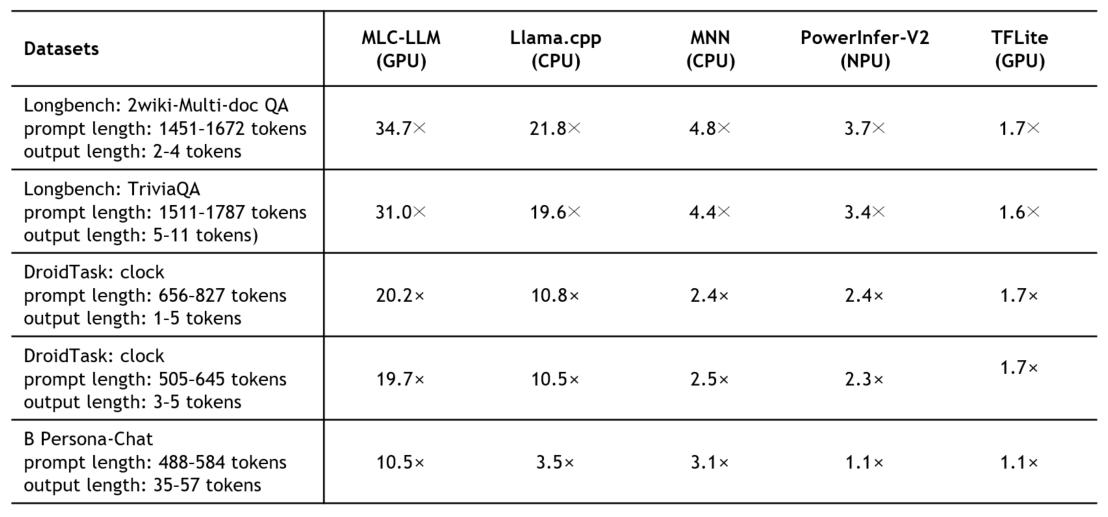 실험에서는 TFLite(GPU), MMN(CPU), llama.cpp(CPU), MLC-LLM(GPU)를, PowerInfer-v2(NPU)로 총 5개의 baseline들과의 비교를 수행했다. 참고로 PowerInfer-v2는 NPU를 활용해 prefill phase를 가속화하는 engine인데, LLM에 대한 최적화를 llm.npu만큼 잘 하지는 못했다고 한다. 또한 각 enigne이 실험하려는 LLM들 중 일부만 지원하기도 하므로, 없는 값들은 결과에서 빠져 있다.