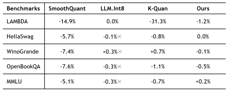 그 결과는 아래와 같다. 여기에서도 실제로는 각 benchmark를 5개의 LLM에서 돌렸지만, 값이 너무 많아서 LLM별로 FP16과 비교한 accuracy 변화 정도를 평균낸 결과만 나타냈다. FP16과 비교했을 때 0.0% ~ 1.2% 정도의 accuracy loss만을 보이며 다른 quantization 기법들보다 높은 accuracy를 보였다.