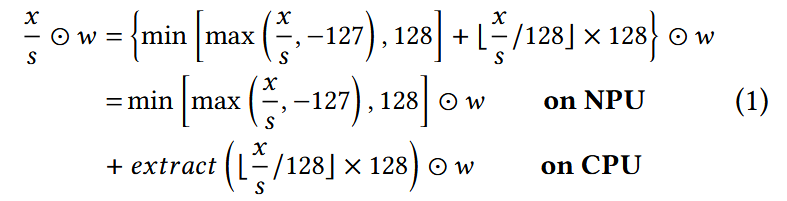 - scale 내부의 값은 NPU에서 INT8 MatMul을 한다. 즉, activation을 scaling factor $s$로 quantize하고 W8A8 MatMul 연산을 한다. 이때 scaling factor $s$는 scale에 대한 threshold로 기능하므로 중요한데, 이는 대규모 corpora에 대한 offline profiling으로 구했다고 한다.