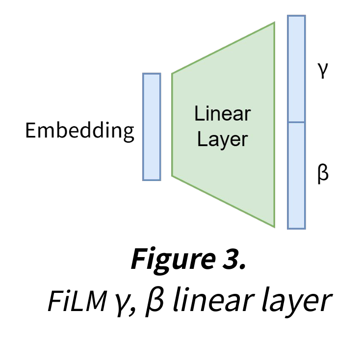 embedding_length x embedding_length * 2 만큼의 linear layer을 사용해 각 embedding에 대한 γ(scale)와 β(shift) 값을 구했다. 이후 FiLM 연산을 수행해 한 branching 이후에 생성되는 두 branch의 각 embedding이 적절히 달라지게 했다.