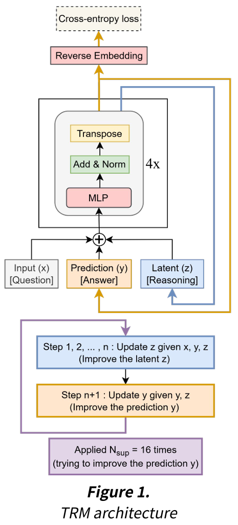 TRM은 transformer block들로 구성된 하나의 network를 사용해, z와 y를 recursive하게 계산한다. 이때 y는 high-level embedding으로 실제 정답을 예측하는 embedding이고, z는 low-level embedding으로 reasoning을 위한 중간 embedding이다.