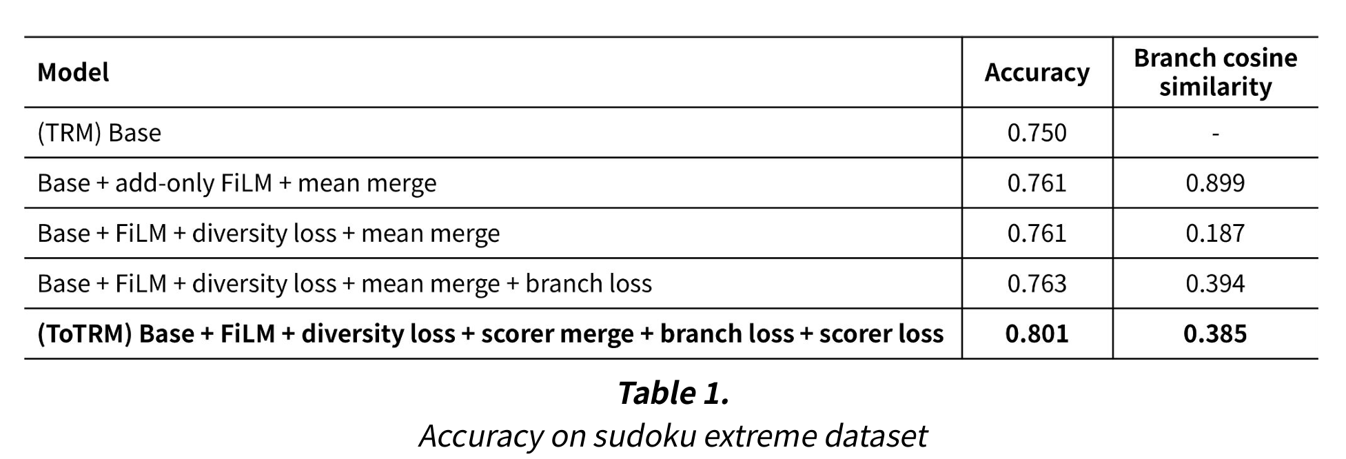 다음과 같이 ablation study를 하며 accuracy를 찍어봤고, ToTRM이 sudoku extreme에서 TRM에 비해 5%p 정도의 accuracy 향상을 보였다. 또한 FiLM, scorer, 새로 추가한 loss들의 유의미함을 확인했다.